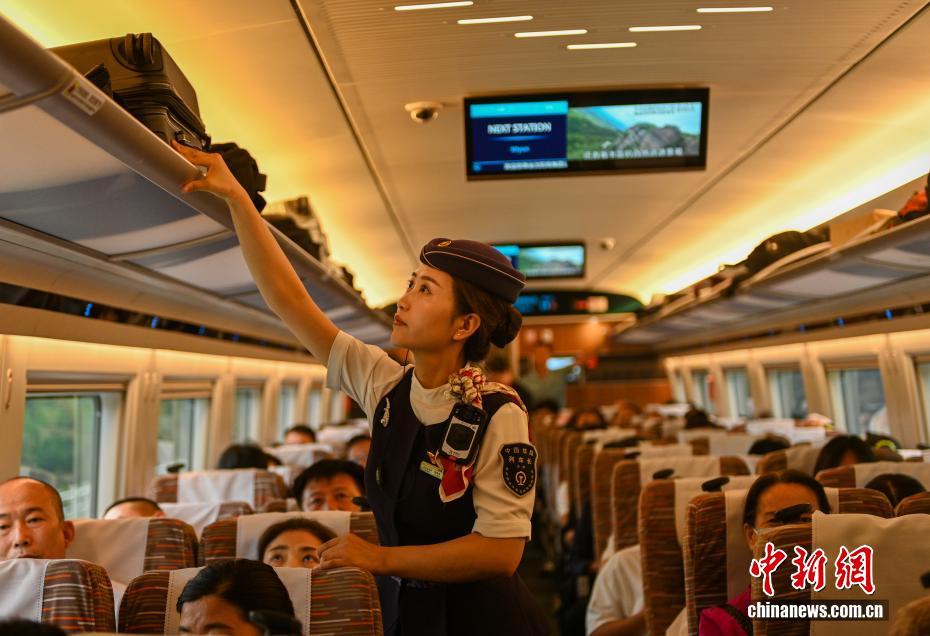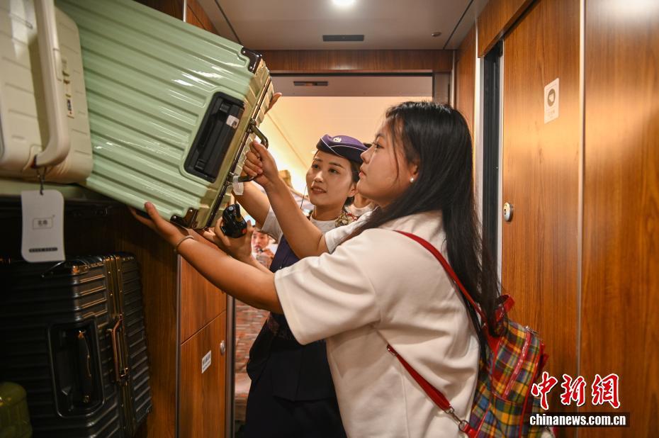8月27日,临近秋季开学,大量学生乘高铁返校。同学们提拉旅行箱,踏上由中国铁路沈阳局集团有限公司沈阳客运段动车三队担当乘务的沈阳南到北京朝阳G3602次列车,列车长谭莉敏热情周到的服务,助力学生顺利返程。京沈高铁是国家“八纵八横”高铁网京哈京港澳通道的组成部分。开行时速350公里复兴号标杆列车,东北地区主要城市与首都间时空距离进一步压缩,旅客出行更加便利。图为谭莉敏在帮助旅客拿行李。