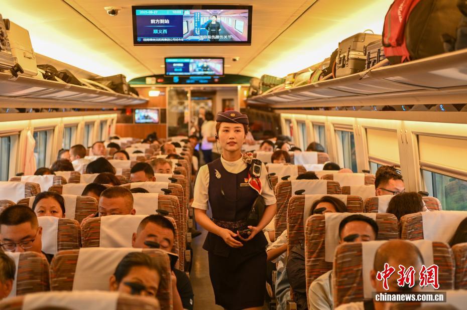 8月27日,临近秋季开学,大量学生乘高铁返校。同学们提拉旅行箱,踏上由中国铁路沈阳局集团有限公司沈阳客运段动车三队担当乘务的沈阳南到北京朝阳G3602次列车,列车长谭莉敏热情周到的服务,助力学生顺利返程。京沈高铁是国家“八纵八横”高铁网京哈京港澳通道的组成部分。开行时速350公里复兴号标杆列车,东北地区主要城市与首都间时空距离进一步压缩,旅客出行更加便利。图为谭莉敏在巡视车厢。