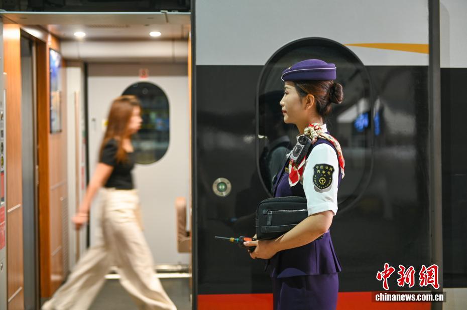8月27日,临近秋季开学,大量学生乘高铁返校。同学们提拉旅行箱,踏上由中国铁路沈阳局集团有限公司沈阳客运段动车三队担当乘务的沈阳南到北京朝阳G3602次列车,列车长谭莉敏热情周到的服务,助力学生顺利返程。京沈高铁是国家“八纵八横”高铁网京哈京港澳通道的组成部分。开行时速350公里复兴号标杆列车,东北地区主要城市与首都间时空距离进一步压缩,旅客出行更加便利。图为谭莉敏在站台上立岗。