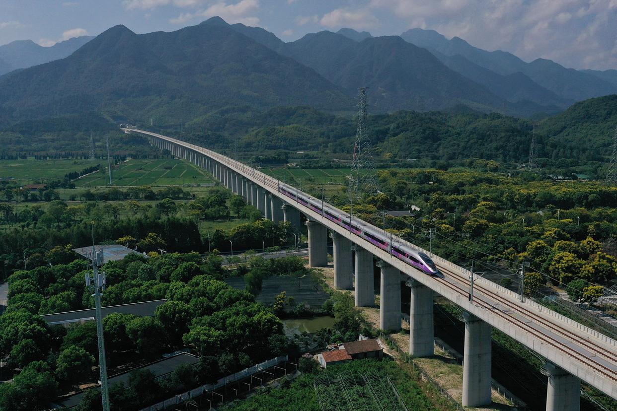 图为高铁列车行驶在杭州市桐庐县境内的杭温高铁跨杭黄铁路特大桥上。杭温高铁自杭州市桐庐东站引出,途经金华市、台州市、温州市,引入温州北站,通过既有杭深铁路延伸至温州南站,正线全长276公里,设计时速350公里。全线设桐庐东、浦江、义乌、横店、磐安、仙居、楠溪江、温州北、温州南等9座车站,于2024年9月6日正式开通运营。