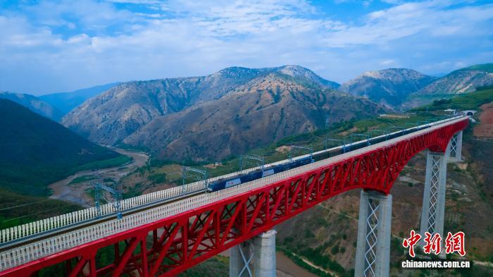 10月27日,中老铁路货运列车通过元江双线特大桥。
