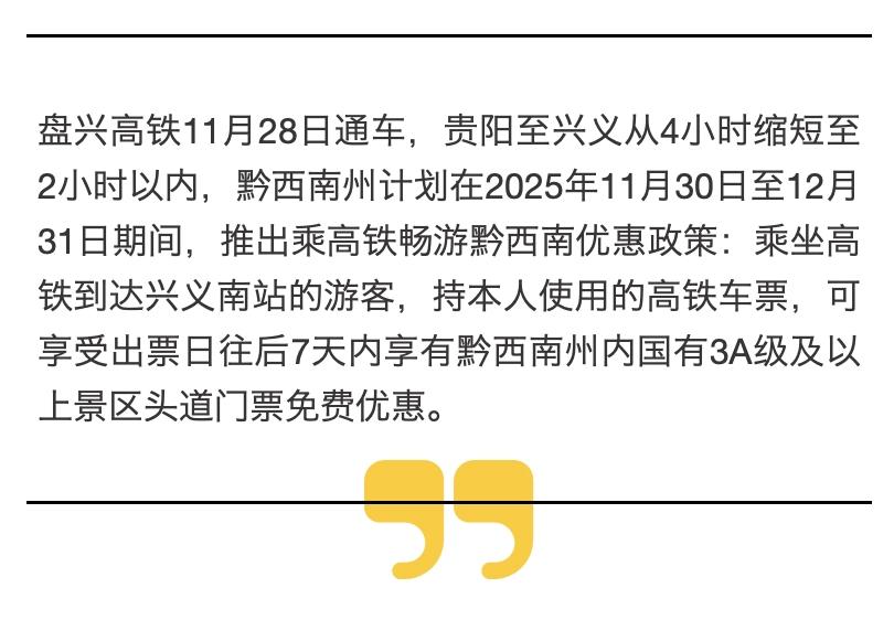 11月28日,贵州“市市通高铁”收官之作——盘兴高铁正式建成通车,标志着黔西南州298万人民的高铁梦想圆满实现。恰逢通车契机,黔西南州同步推出秋冬旅游重磅福利:2025年11月30日至12月31日,乘坐高铁抵达兴义南站的游客,凭本人有效高铁车票,可在出票后7天内享受州内40余个国有3A级及以上景区头道门票免费优惠(温泉景区及景区内经营性项目除外),邀八方来客共赴康养秘境之旅。