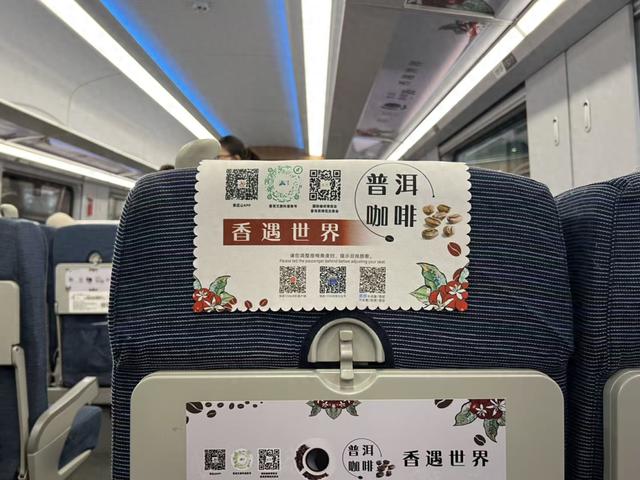 踏入车厢,浓郁的咖啡氛围扑面而来。头枕片、小桌板、行李架等区域均印着“普洱咖啡 香遇世界”主题标识,陈列的普洱咖啡豆更添真实质感,扫码就能一键获取景迈山游玩、普洱文旅动态及国际咖啡博览会等资讯,旅途间隙便能沉浸式了解咖啡文化与当地旅游资源。