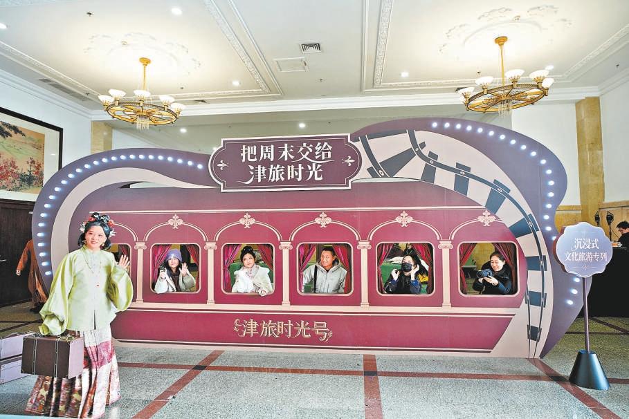 近日,“津旅时光号”旅游专列从北京站开往天津北站,位于北京站的主题展板成为旅客的打卡点。
