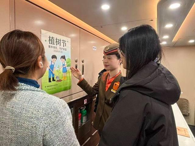 列车飞驰,春意相伴。此次植树节主题宣传活动,不仅丰富了旅客的旅途文化生活,更让绿色环保理念深入人心,进一步引导广大旅客树立生态文明意识,用实际行动守护绿水青山,让文明与绿意一路同行。