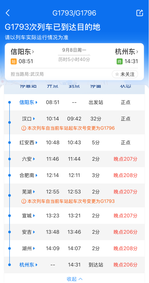 据了解,该列车原计划8时51分从信阳东站发车,14时31分抵达杭州东站,且正点到达红安西站。当日11时10分,列车因动车组供电设备故障被迫停车,此后途经站点均晚点约207分钟(3小时27分钟)。途中抵达芜湖站后,车次号变更为G1793。